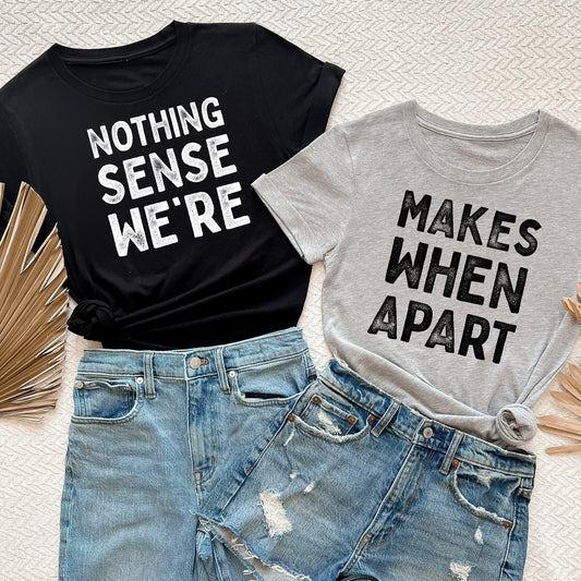 Find the perfect match with our collection of couples t-shirts! Whether you're looking for matching his and hers shirts, cute and quirky designs, or simply a comfortable and stylish way to show your love, our collection has something for every couple. Made from soft and comfortable materials, our couples t-shirts are perfect for wearing on date nights, at events, or just around town. With a range of sizes and designs to choose from, you'll find the perfect match for you and your significant other. From "Together Forever" to "Better Together" and "Soulmates", our collection of couples t-shirts is the perfect way to show the world your love. Browse our collection now and find the perfect match for you and your partner!