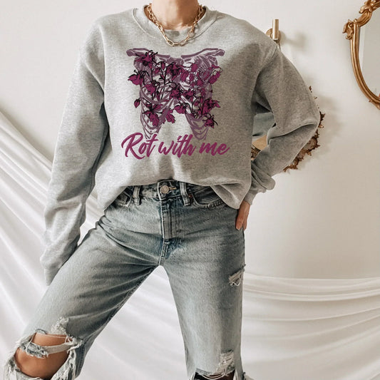 Rot with Me, Gothic Shirt, Halloween Sweatshirt, Witchy Vibes, Bats & Dead Roses Shirt, Moon Shirt, Magical Witch Shirt, Goth Style, Rot with Me, EMO Tee